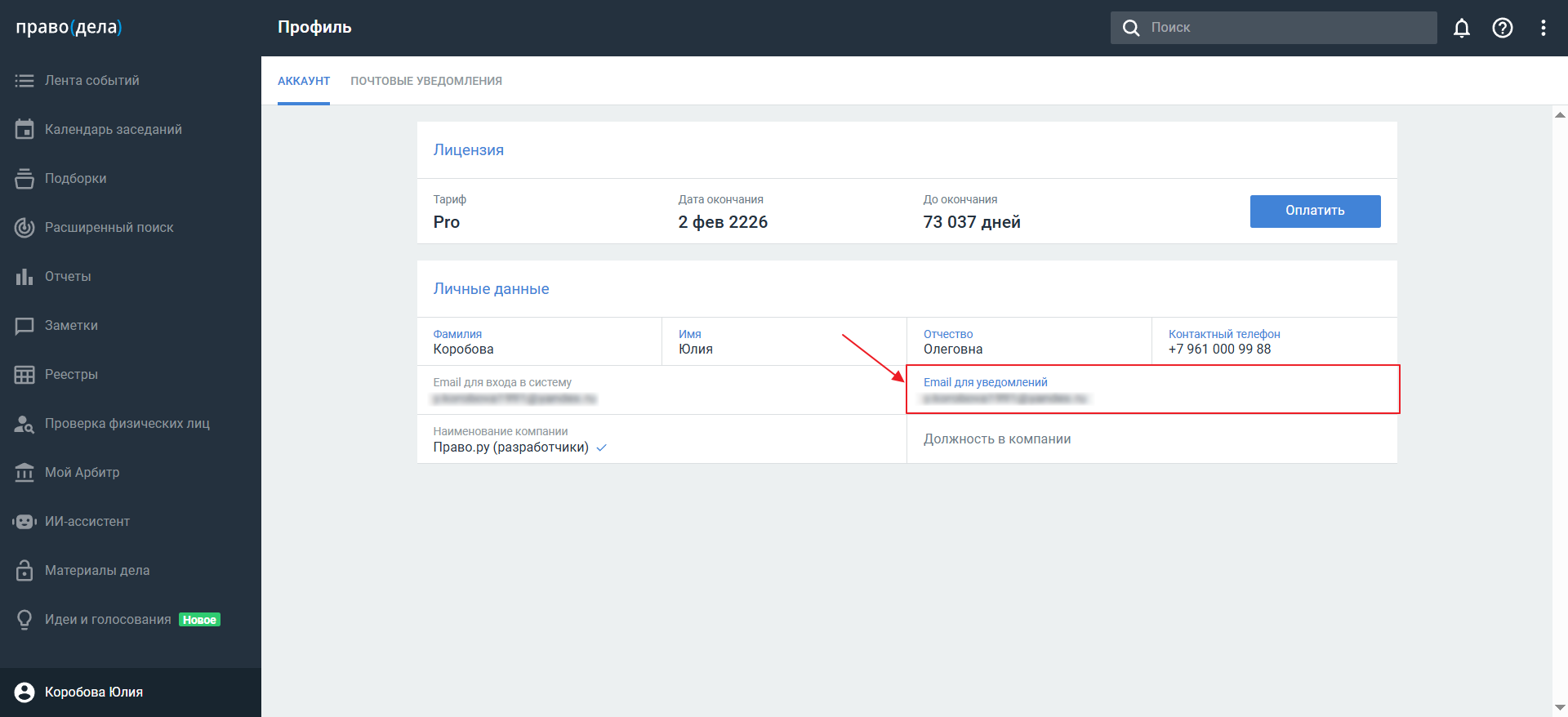 Нажмите на своё ФИО в нижней части главного меню. На вкладке Аккаунт в поле Email для уведомлений укажите новую электронную почту и нажмите кнопку