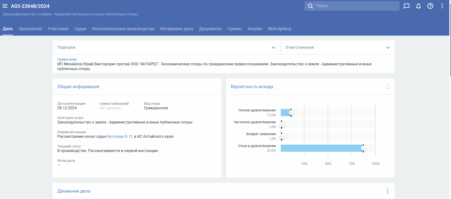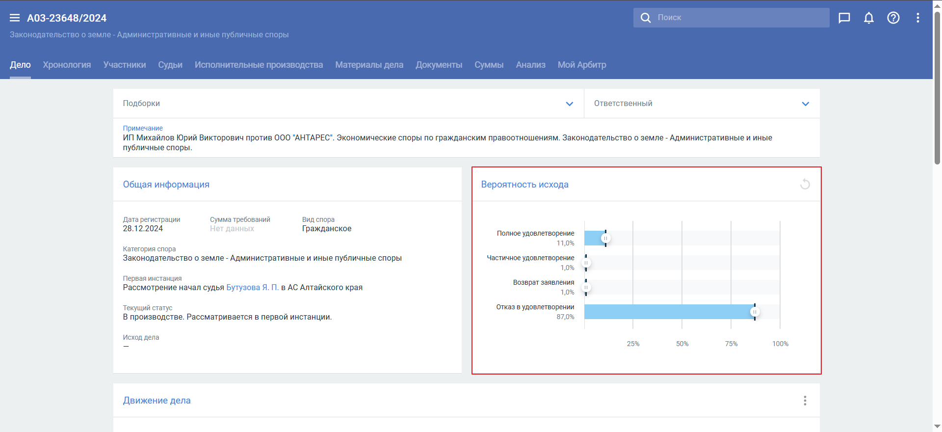 На вкладке Дело в блоке Вероятность исхода отображается предсказанная вероятность исхода дела: