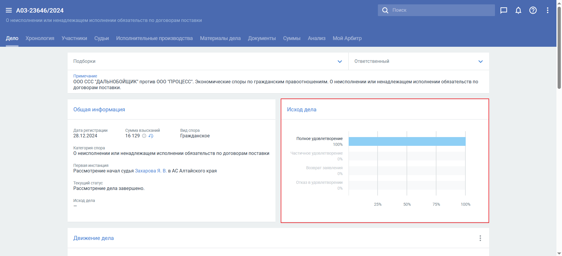 Для завершенных дел название блока меняется на "Исход дела" и в нем отображается фактический исход дела.
