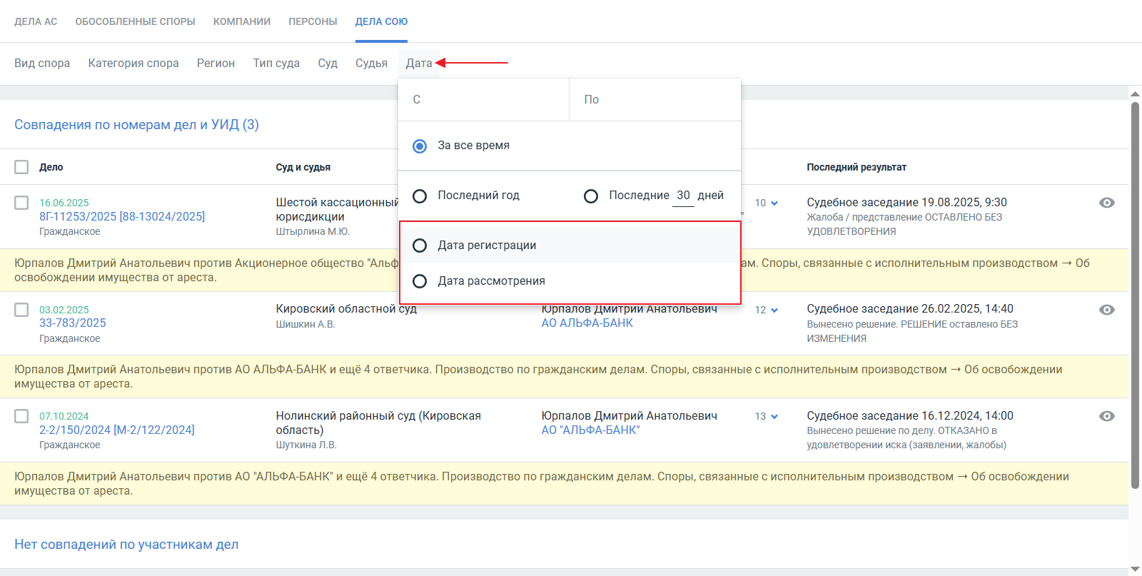 В общем списке доступна фильтрация дел СОЮ по параметру Дата со значениями "Дата регистрации" и "Дата рассмотрения".