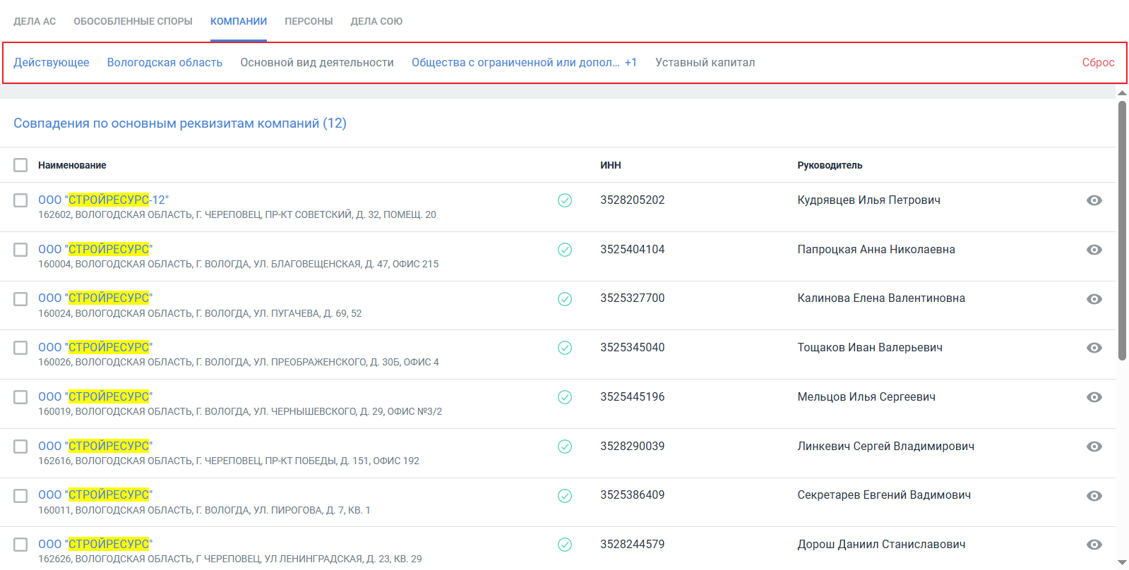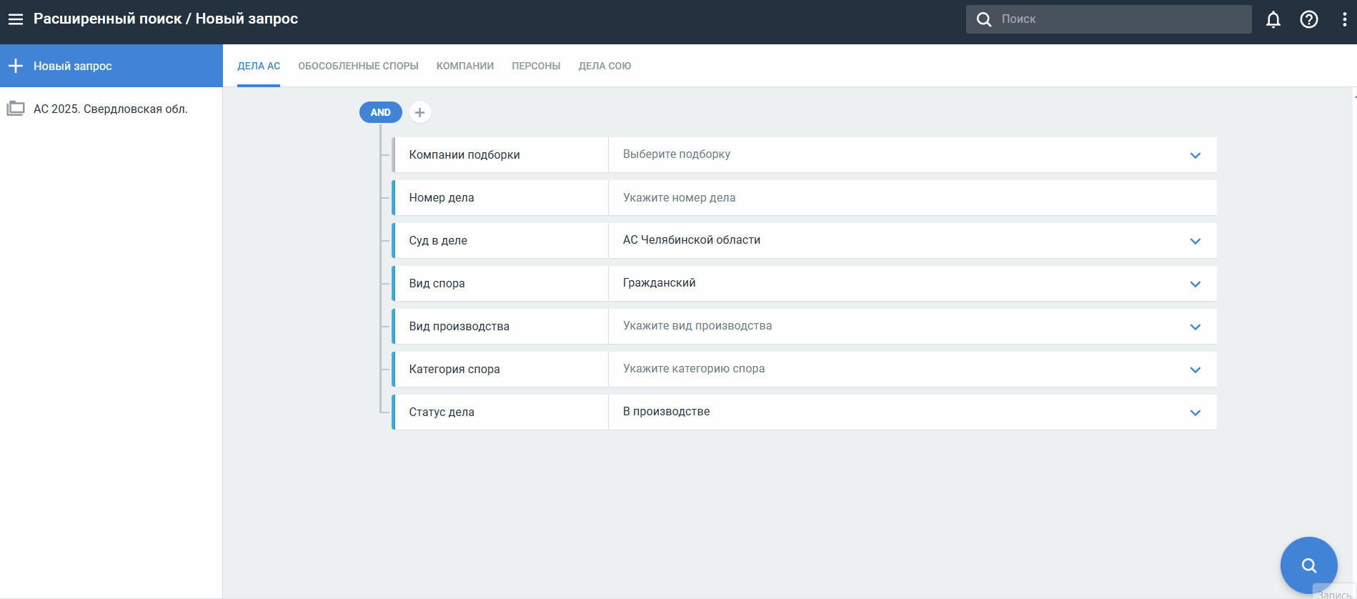 Установите интересующие параметры или выберите сохраненный поисковый запрос. Нажмите кнопку . Будет выполнен поиск компаний/дел по заданным параметрам.