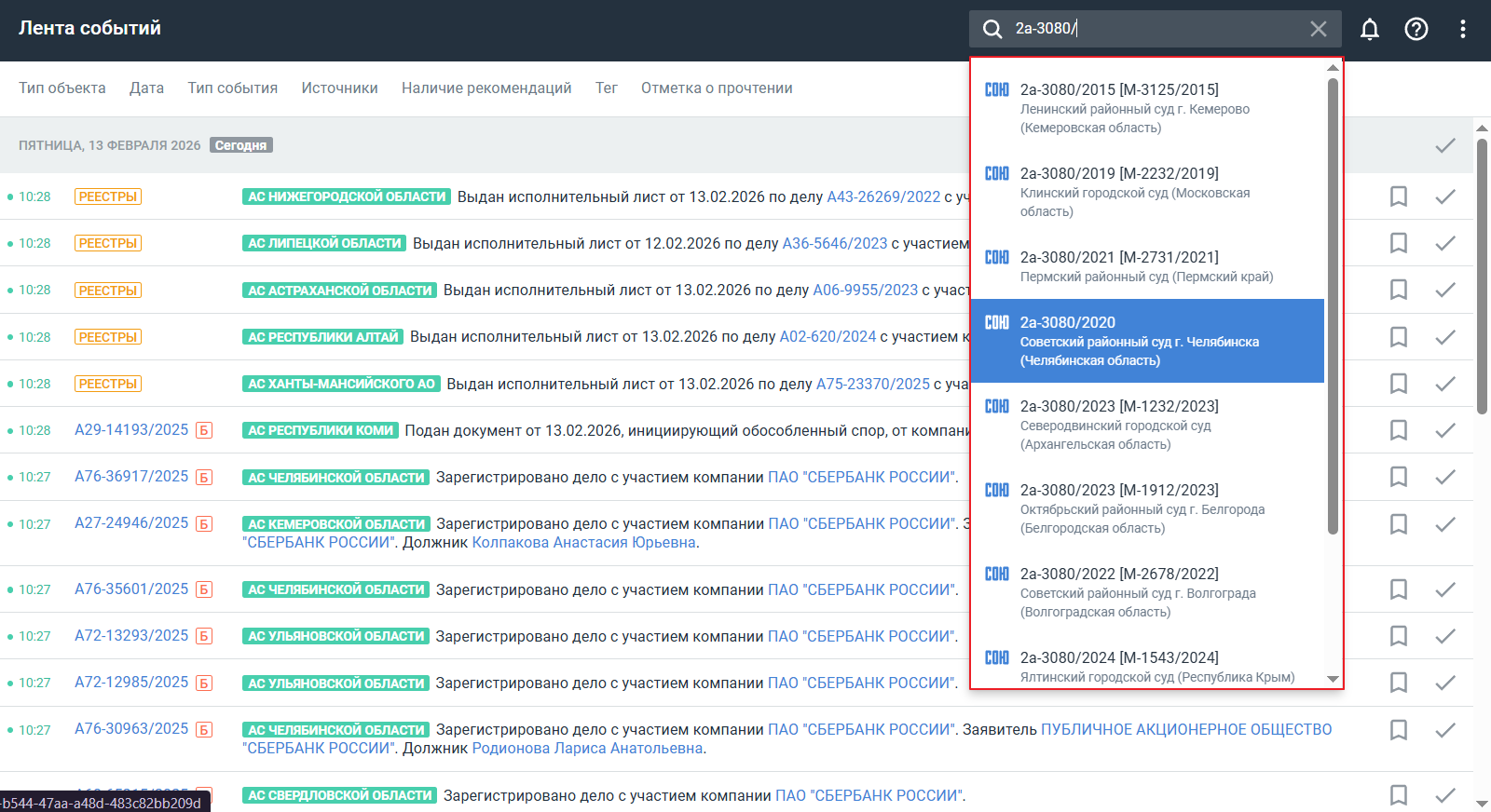 Для дел СОЮ в раскрывающемся списке результатов быстрого поиска отображается не только номер, но и суд, в котором рассматривалось/рассматривается дело.