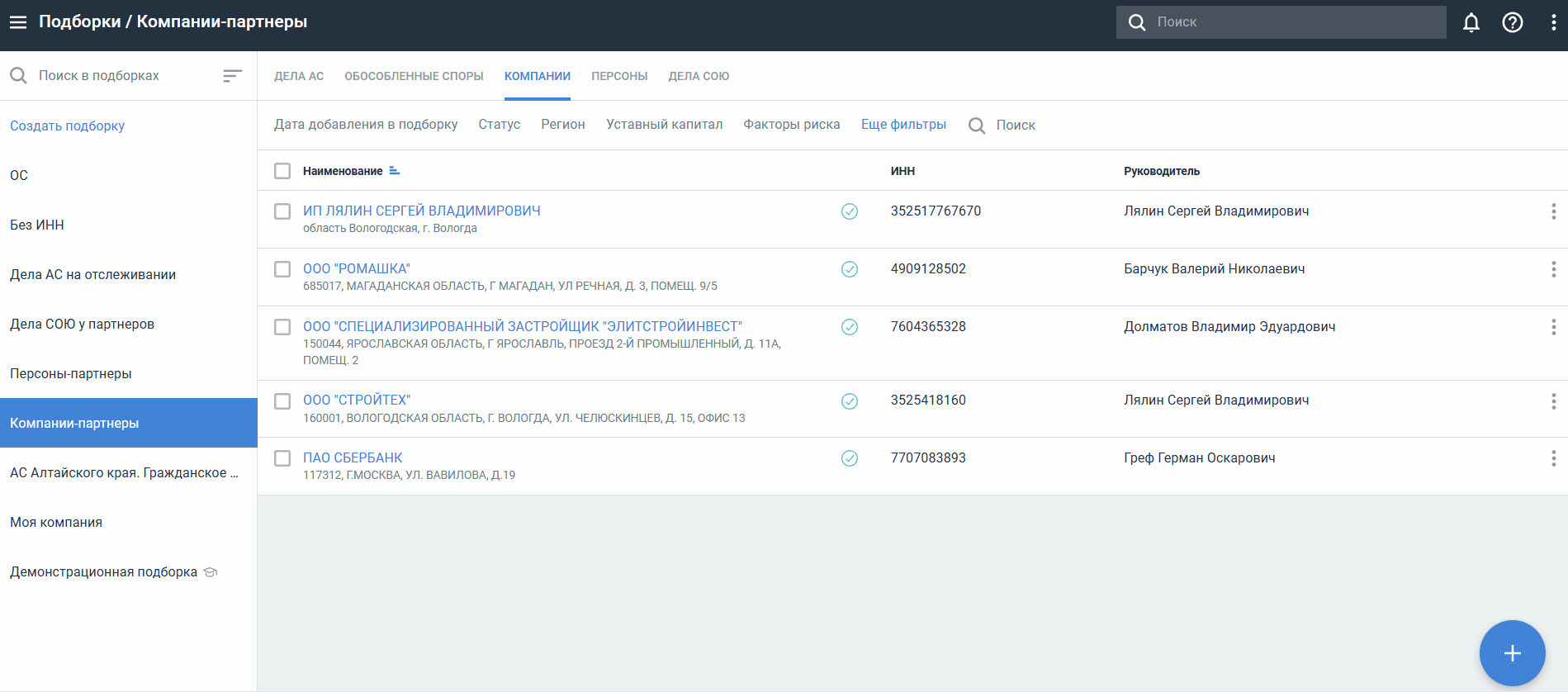 Для быстрого доступа к интересующим вас участникам распределите их по соответствующим подборкам. После добавления организации в подборку вы сможете отслеживать в ленте основные события — например, смена реквизитов, смена директора, информация о новых делах с участием компании.