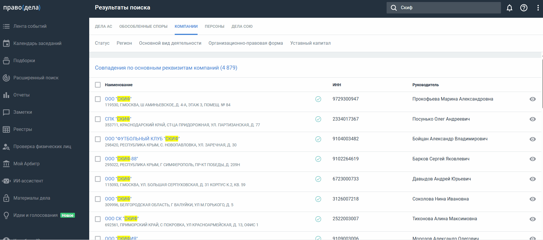 Из списка выберите нужный вариант. В результатах отображается наименование компании и ИНН. При наведении курсора на строку отображается адрес компании.