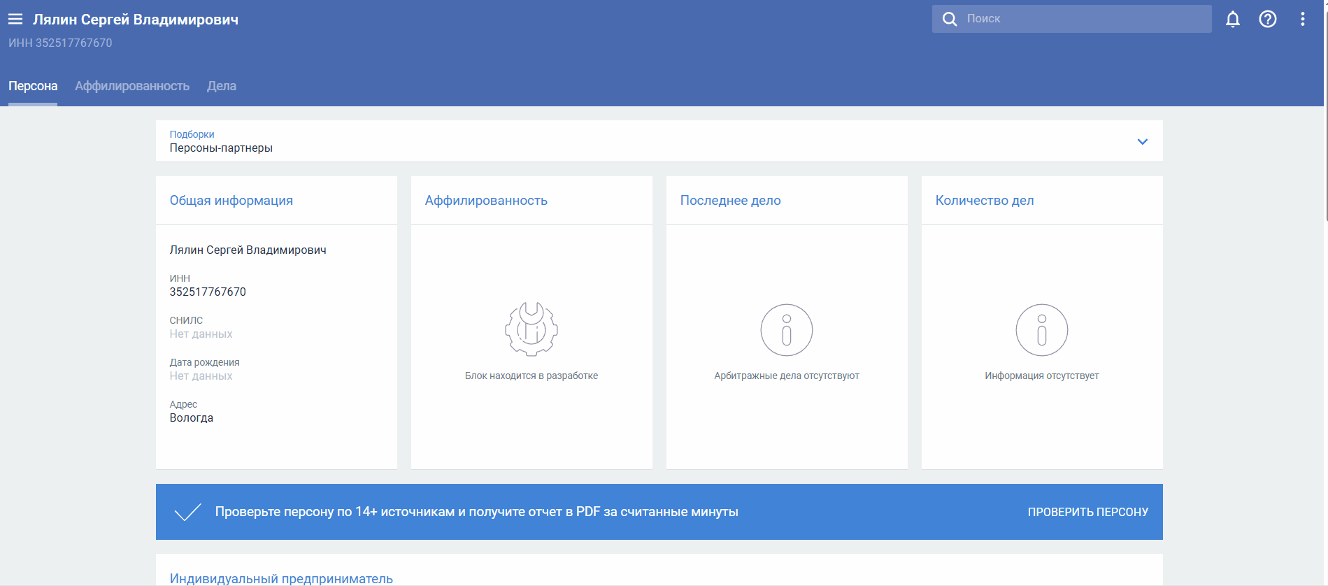 В разделе Персоны можно найти определенного человека в выбранной подборке. Для этого укажите его ФИО, ИНН или СНИЛС в строке быстрого поиска.