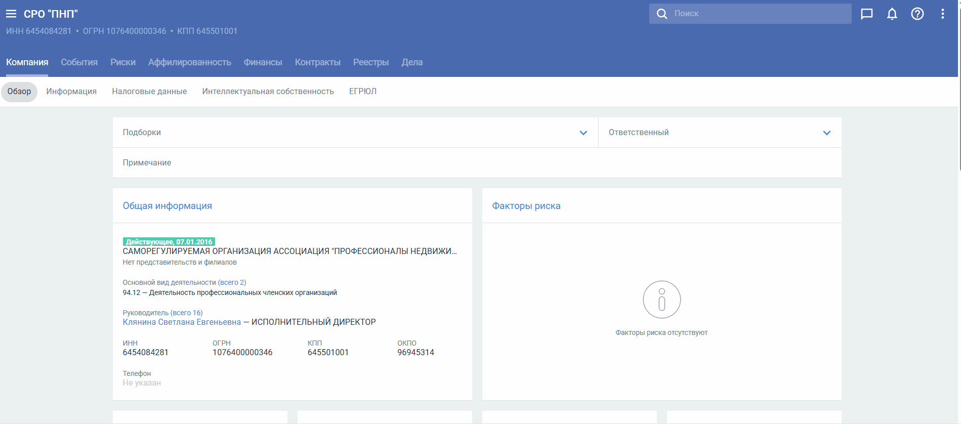 В карточке Саморегулируемой организации арбитражных управляющих вы можете ознакомиться с общей информацией и списком входящих в СРО арбитражных управляющих. Остальные разделы и функциональные возможности карточки СРО аналогичны функционалу карточки компании.