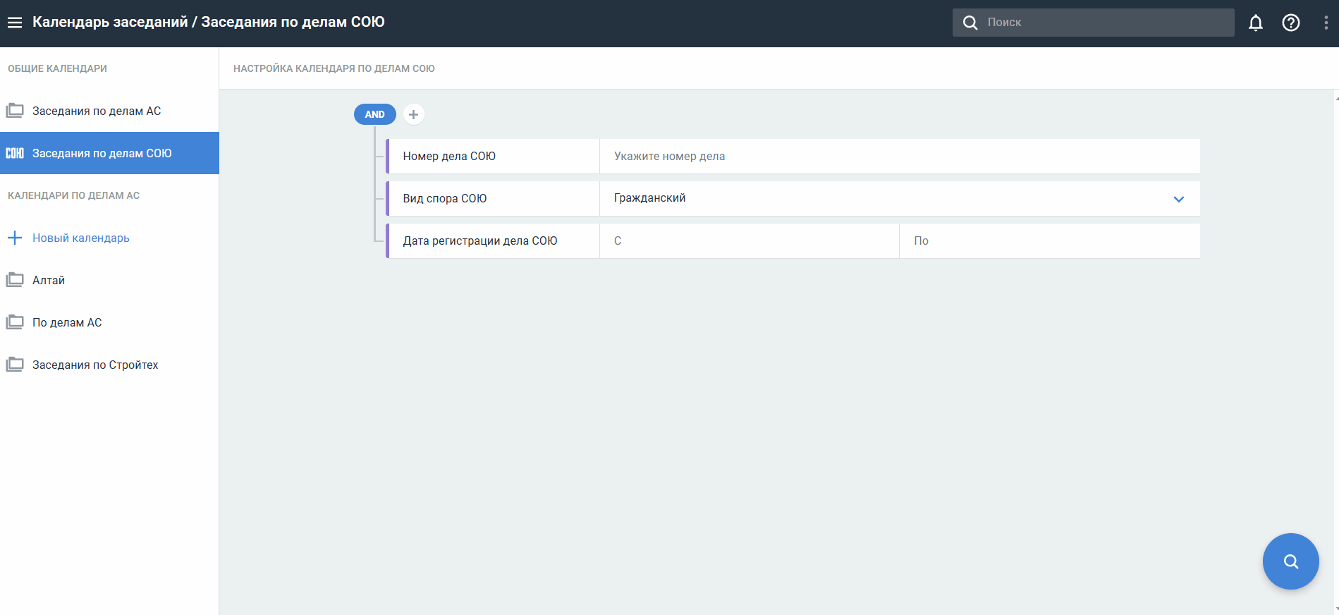Пользователь может посмотреть календарь заседаний только для дел СОЮ: