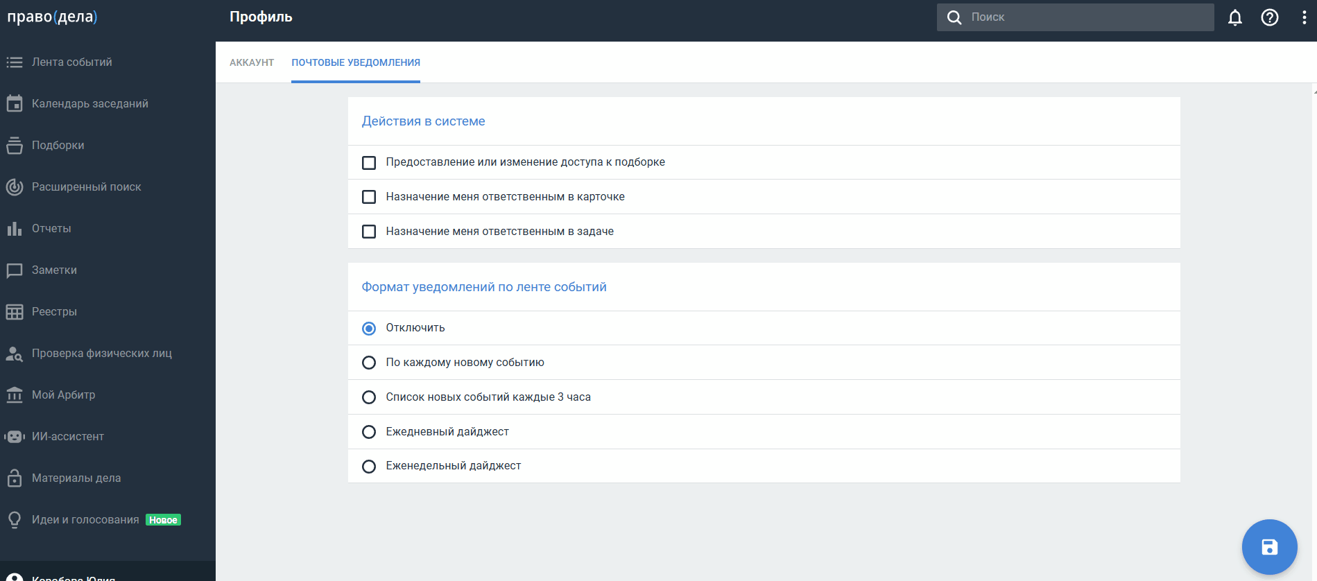 В разделе Профиль вы можете выбрать тип почтовых уведомлений и настроить периодичность почтовой рассылки по ленте событий.