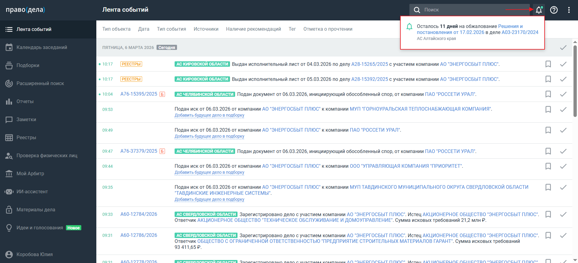 На верхней панели находится нотификатор, показывающий список отслеживаемых дел, по которым скоро истечет срок обжалования. Уведомления отображаются по всем делам, добавленным в подборки, и по делам, к которым предоставлен совместный доступ через подборки.