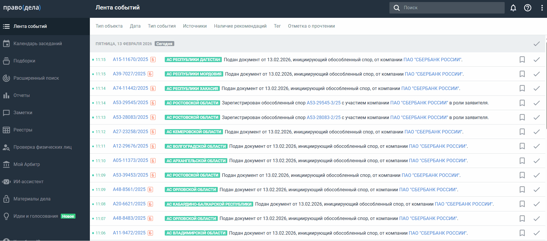 Найденные через быстрый или расширенный поиск объекты можно сразу добавить в подборку. Единовременно можно добавить не более 1000 компаний/дел.