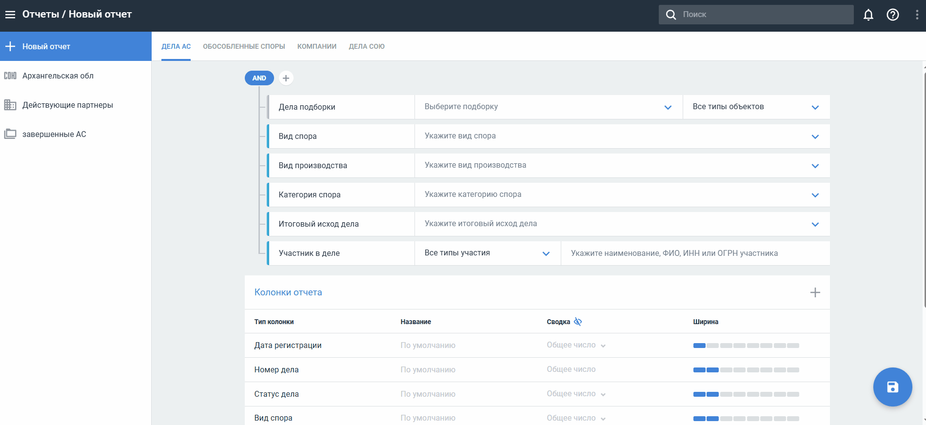 Вы можете самостоятельно сформировать отчет по делам АС, обособленным спорам, компаниям или делам СОЮ.