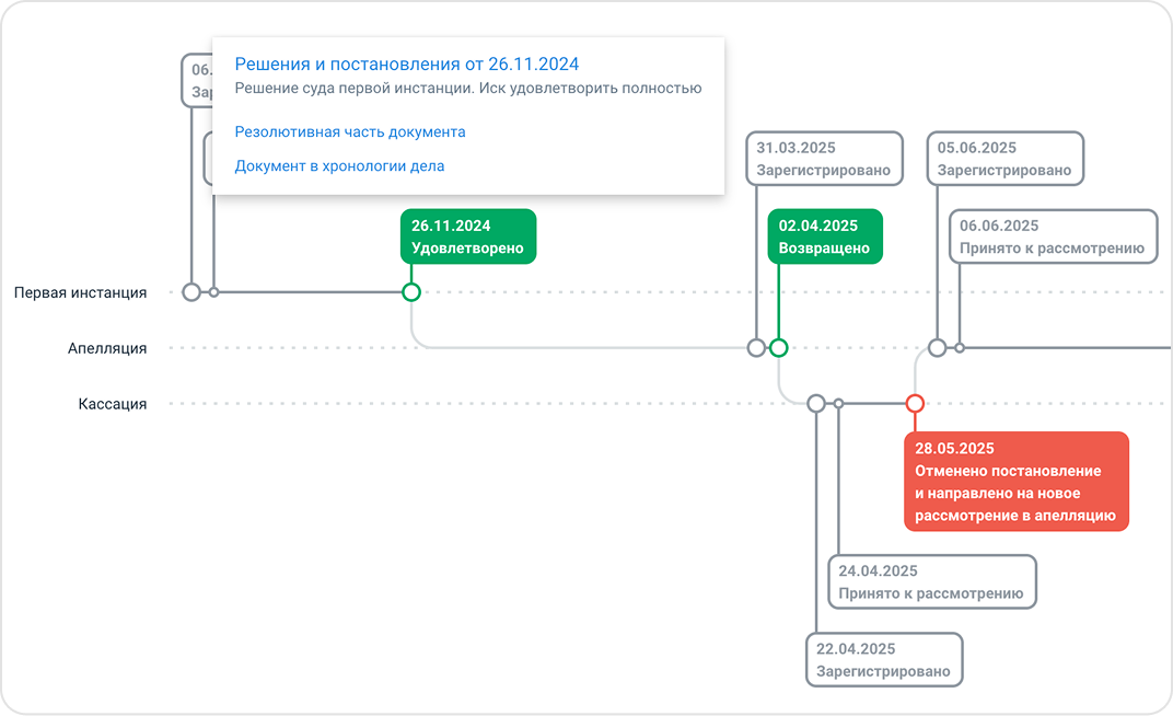 Новый блок «Движение дела» автоматически строит карту процесса по арбитражным делам. Больше не нужно разбирать длинную хронологию и вручную восстанавливать путь спора.