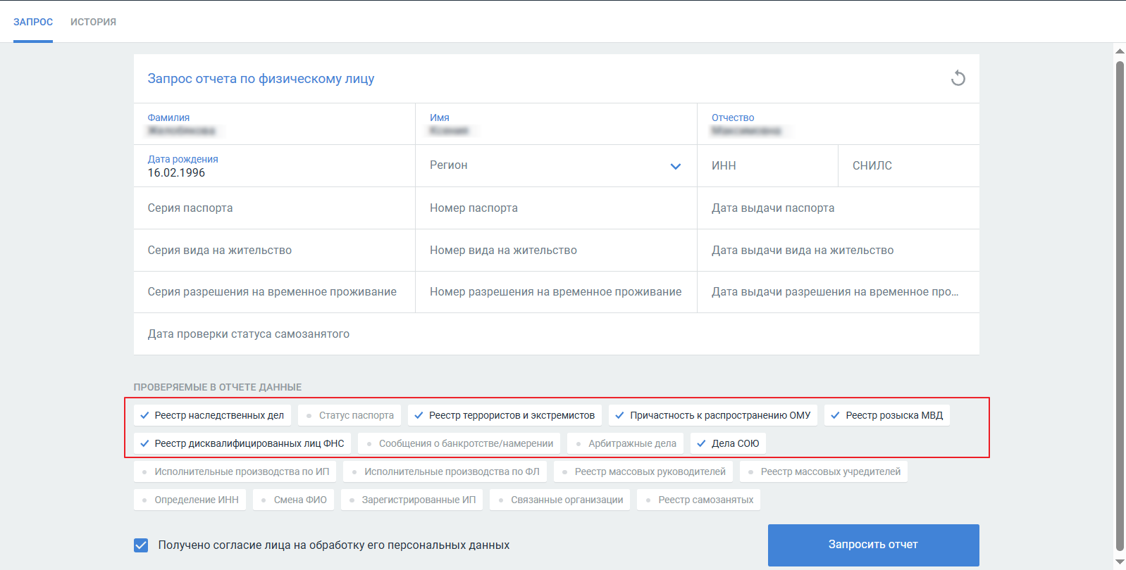 - Установите флаг Получено согласие лица на обработку его персональных данных.